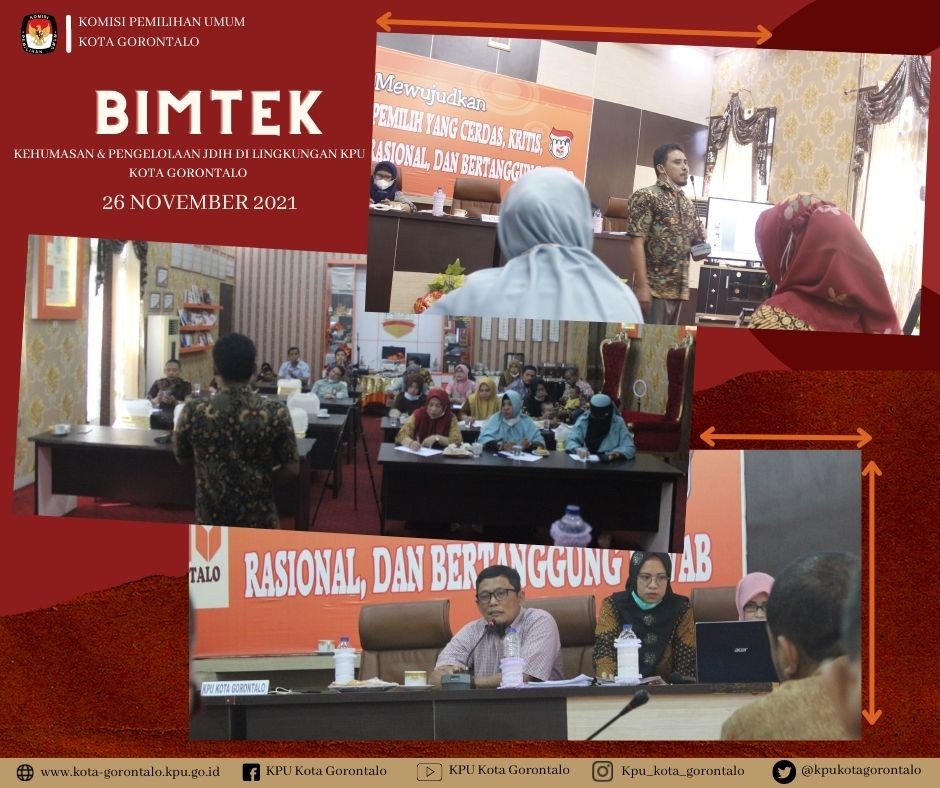 Guna Meningkatkan Kapasitas Sumber Daya Manusia, Divisi Sosialisasi Pendidikan Pemilih Parmas SDM, dan Divisi Hukum dan Pengawasan KPU Kota Gorontalo Menggelar kegiatan Bimtek terkait Kehumasan dan Pengelolaan Jaringan Informasi dan Dokumentasi Hukum (JDIH) Pada Jumat (26/11) bertempat di Aula Rumah pintar pemilu Mootenilo KPU Kota Gorontalo.,