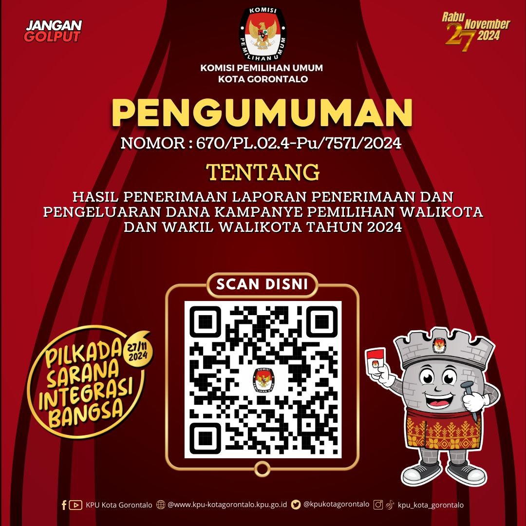 Gorontalo, 26 November 2024 - Berikut kami sampaikan Pengumuman Hasil Penerimaan Laporan Penerimaan dan Pengeluaran Dana Kampanye (LPPDK) Pemilihan Walikota dan Wakil alikota Gorontalo Tahun 2024. Selengkapnya dapat dilihat DISINI