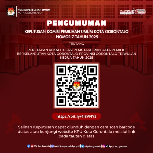 #TemanPemilih, Komisi Pemilihan Umum (KPU) Kota Gorontalo telah menggelar Rapat Pleno Terbuka Rekapitulasi Daftar Pemilih Berkelanjutan (DPB) untuk Triwulan II Tahun 2025 pada Rabu (2/7/2025). Berikut ini kami sampaikan Keputusan Komisi Pemilihan Umum Kota Gorontalo Nomor 7 Tahun 2025 Tentang Penetapan Rekapitulasi Pemutakhiran Data Pemilih Berkelanjutan Kota Gorontalo Provinsi Gorontalo Triwulan Kedua Tahun 2025. Selengkapnya DISINI