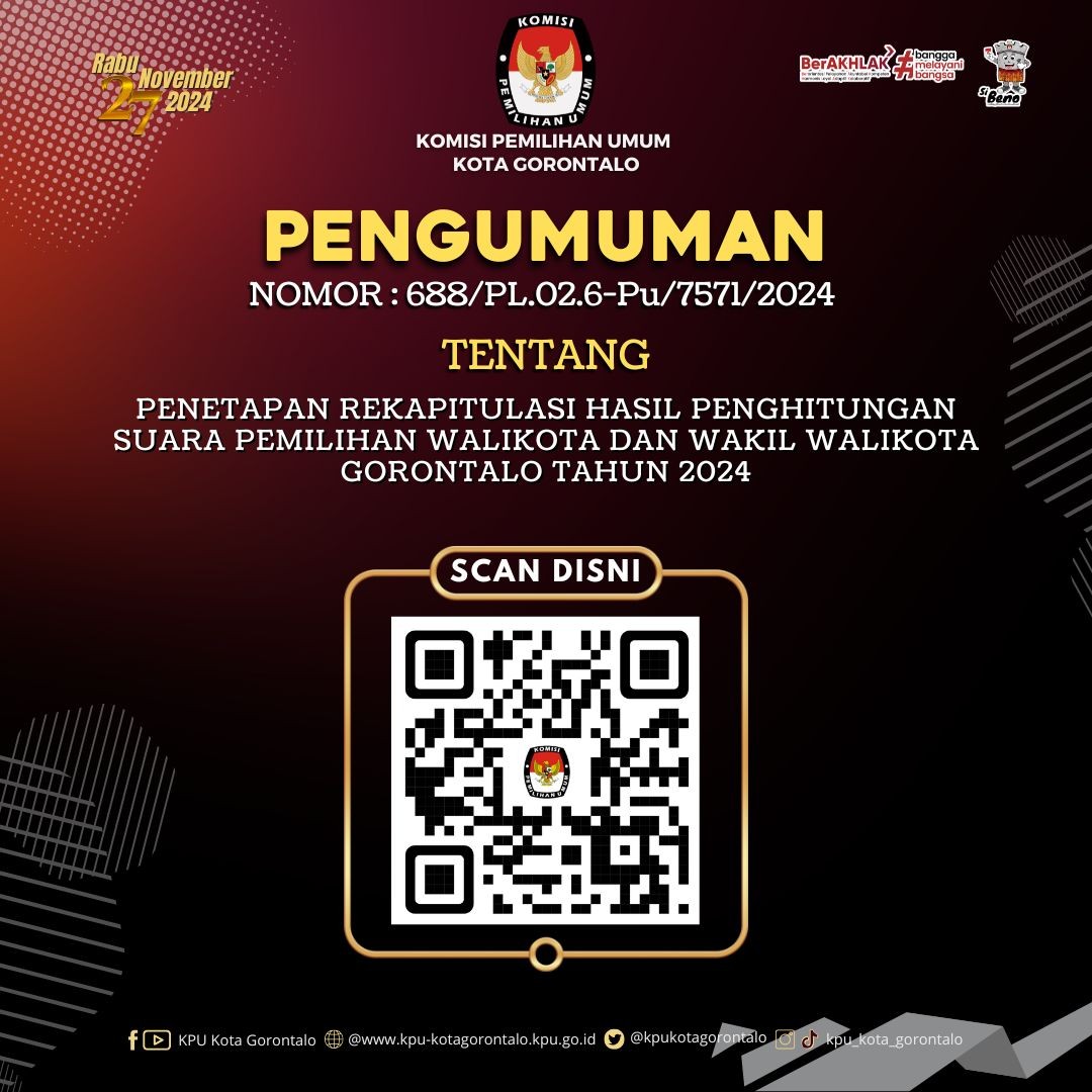 Gorontalo, 3 Desember 2024 - PENGUMUMAN NOMOR: 688/PL.02.6-Pu/7571/2024 TENTANG PENETAPAN REKAPITULASI HASIL PENGHITUNGAN SUARA PEMILIHAN WALIKOTA DAN WAKIL WALIKOTA GORONTALO TAHUN 2024