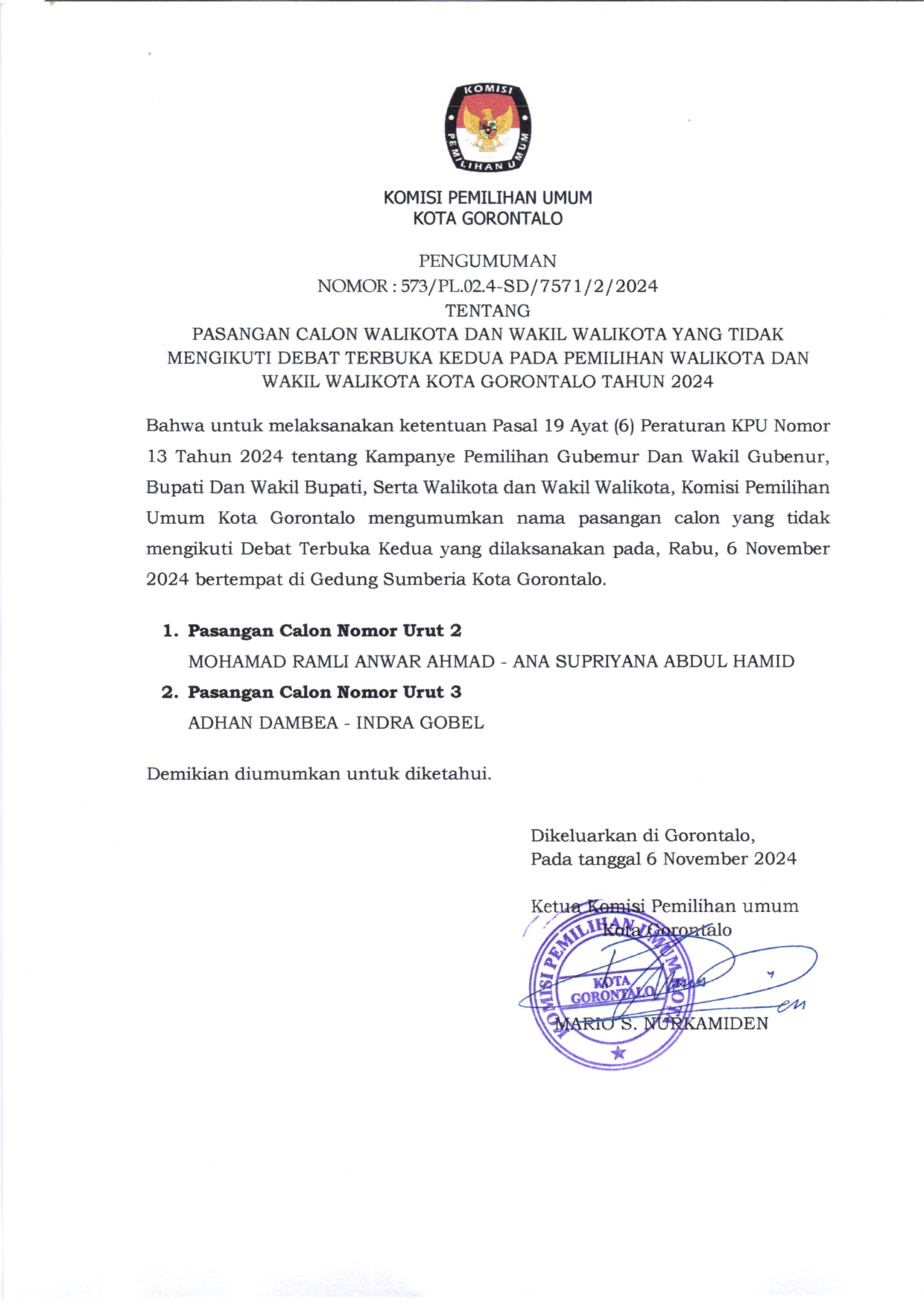 Pengumuman KPU Kota Gorontalo tentang Pasangan Calon Walikota dan Wakil Walikota yang tidak mengikuti Debat Terbuka Kedua