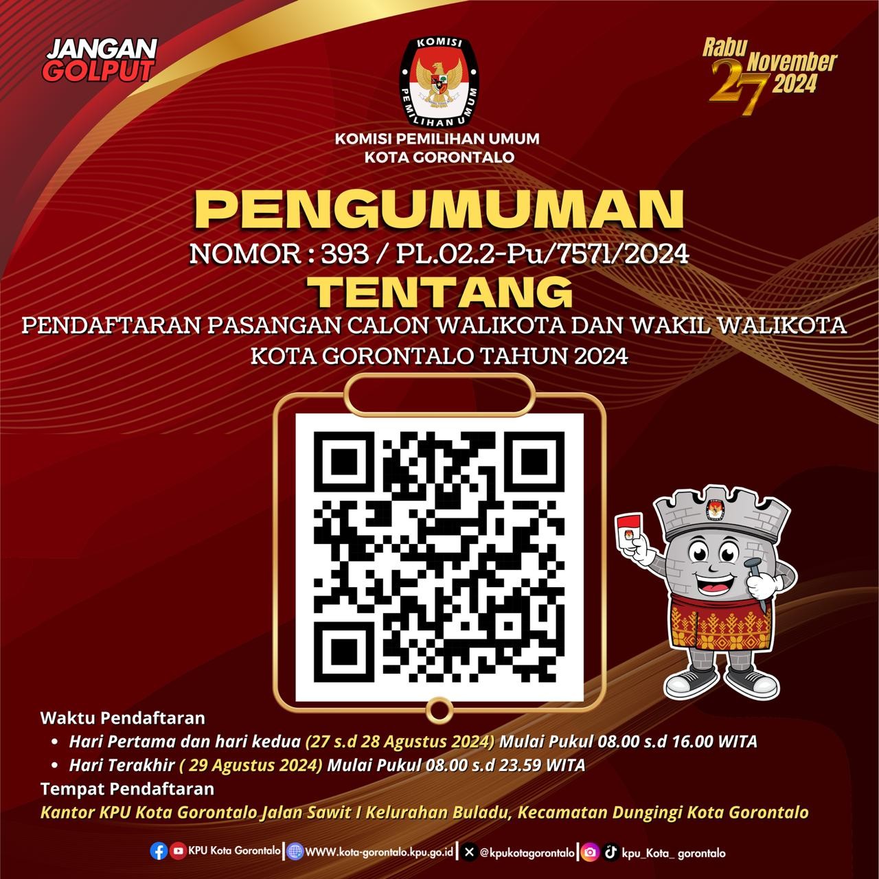 Pengumuman Nomor : 393/PL.02.2-Pu/7571/2024 tentang Pendaftaran Pasangan Calon Walikota dan Wakil Walikota Kota Gorontalo Tahun 2024. Bahwa untuk melaksanakan ketentuan Pasal 95 ayat (1) Peraturan KPU Nomor 8 Tahun 2024 tentang Pencalonan Gubernur dan Wakil Gubernur, Bupati dan Wakil Bupati, serta Walikota dan Wakil Walikota Kota Gorontalo Tahun 2024. Selengkapnya dapat dilihat di Sini.