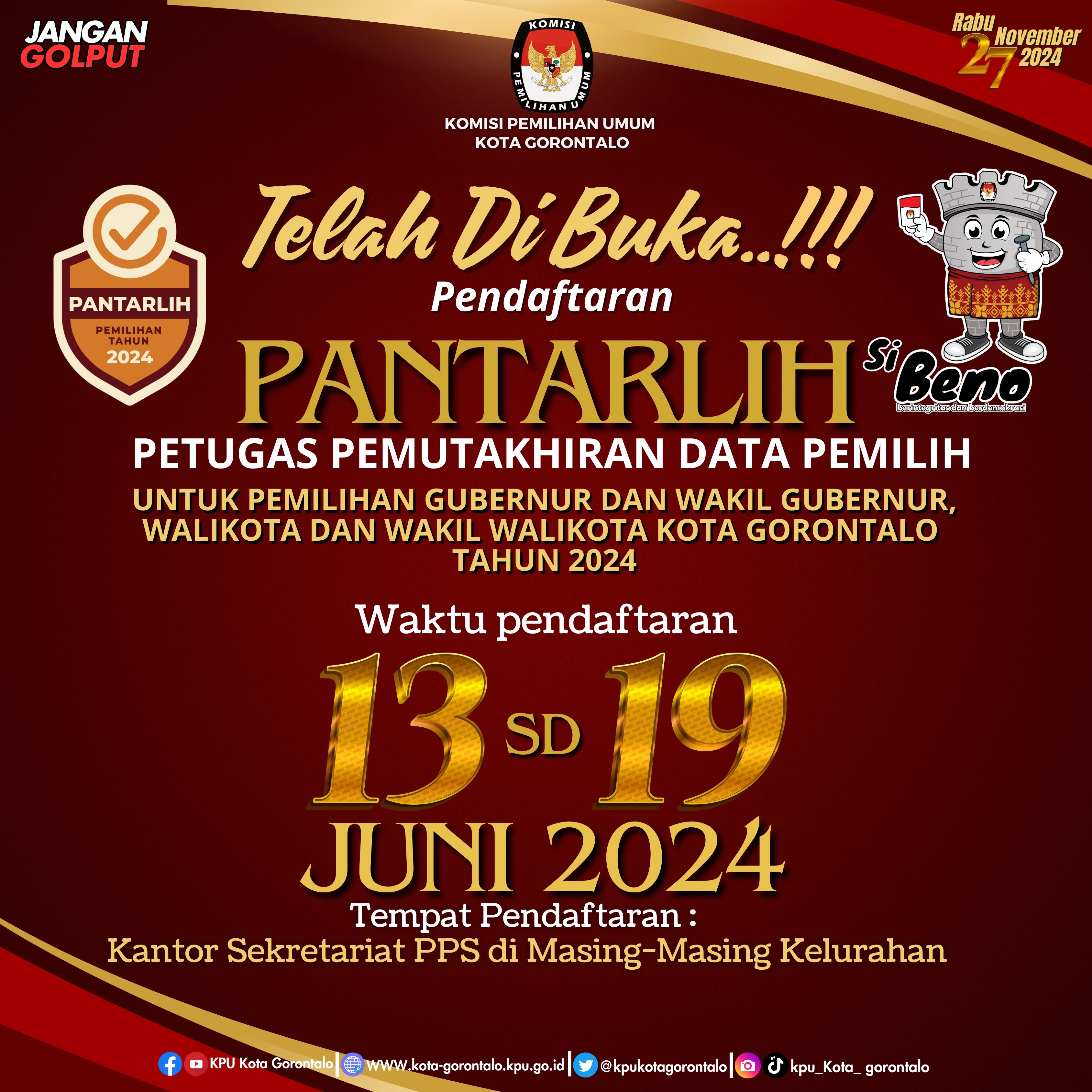 Berikut Pengumuman seleksi Panitia Pemutakhiran Data Pemilih (PANTARLIH) pada Pilkada Serentak 2024 di Kota Gorontalo. Selengkapnya Lihat