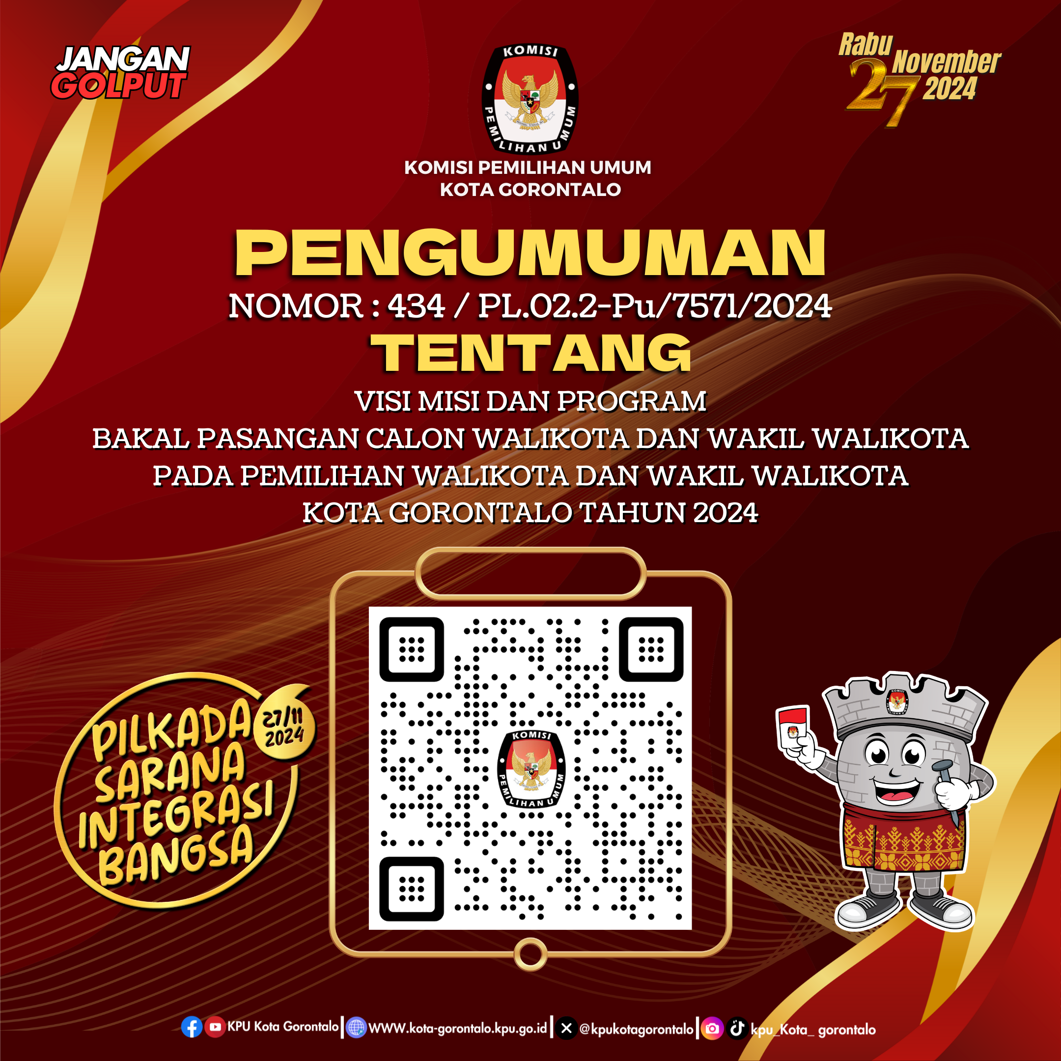Bahwa untuk melaksanakan ketentuan Pasal 13 Ayat (1) huruf d angka 4 Peraturan KPU Nomor 8 Tahun 2024 tentang Pencalonan Gubernur dan Wakil Gubernur, Bupati dan Wakil Bupati, serta Walikota dan Wakil Walikota yang telah diubah dengan Peraturan KPU Nomor 10 Tahun 2024 tentang Perubahan Atas Peraturan KPU Nomor 8 Tahun 2024 tentang Pencalonan Gubernur dan Wakil Gubernur, Bupati dan Wakil Bupati, serta Walikota dan Wakil Walikota, Komisi Pemilihan Umum Kota Gorontalo mengumumkan naskah Visi, Misi dan dan Program Pasangan Calon telah sesuai dengan Rencana Pembangunan Jangka Panjang Daerah.