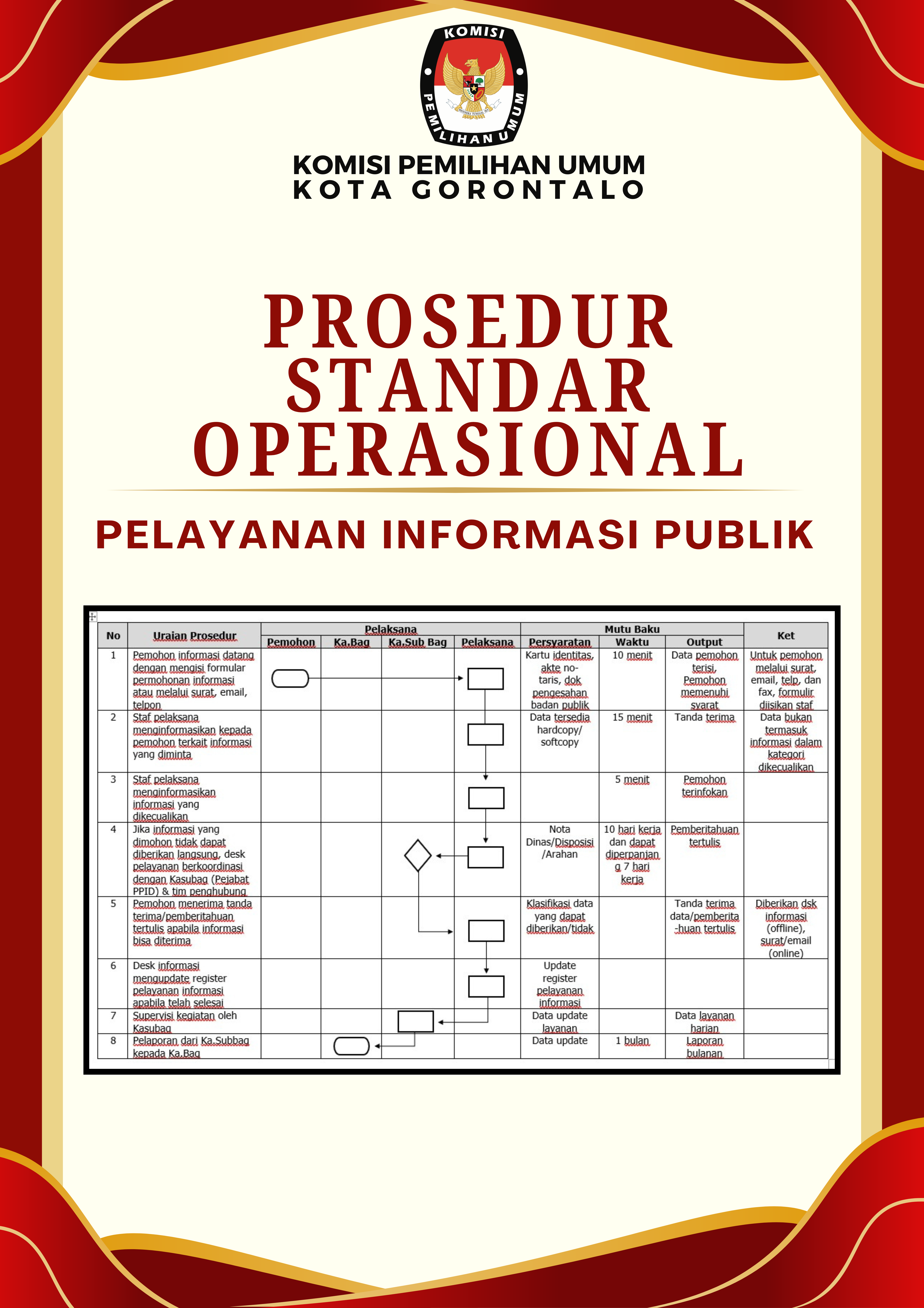 Teman pemilih, berikut kami sampaikan Standar Operasional Prosedur (SOP) Pelayanan Informasi Publik di KPU Kota Gorontalo.